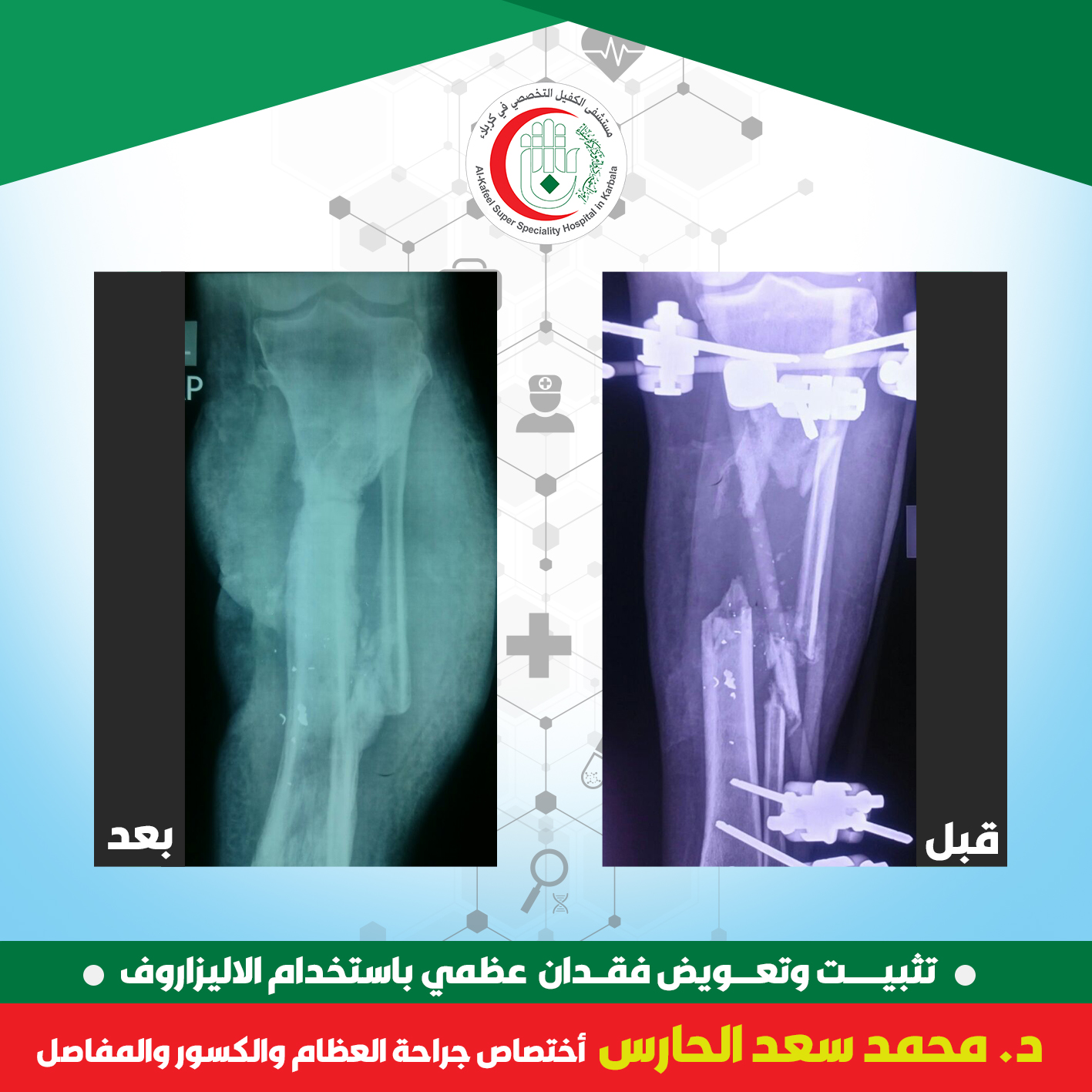 وبين الحارس، بعد معاينة صور الاشعة للمقاتل قمنا بالتخطيط للحالة بطريقة علمية وقررنا إجراء عمليتين له، تضمنت تثبيت الكسر الذي كان بالساق مع تعويض الفقدان العظمي وترميم الانسجة باستخدام تقنية اليزاروف.