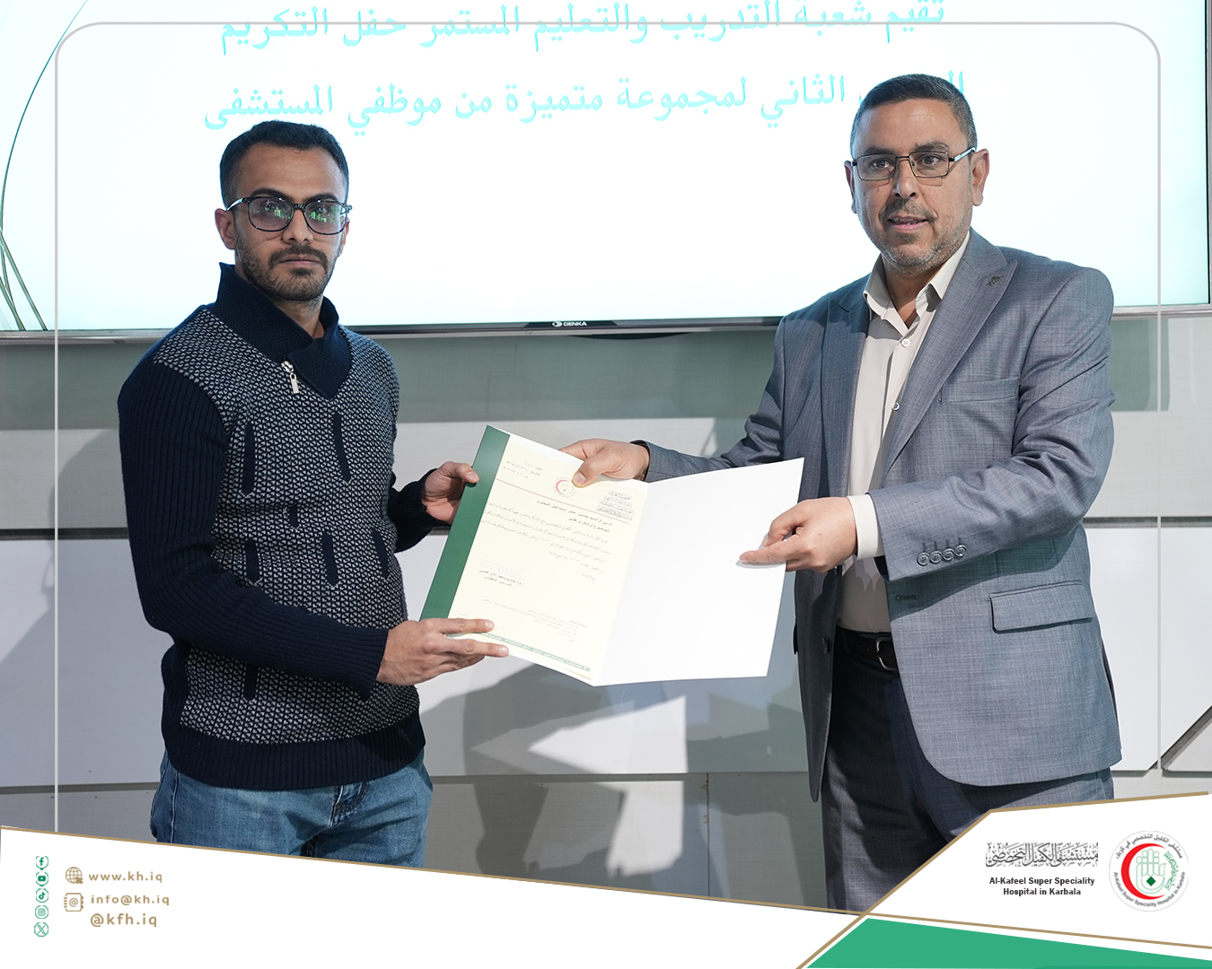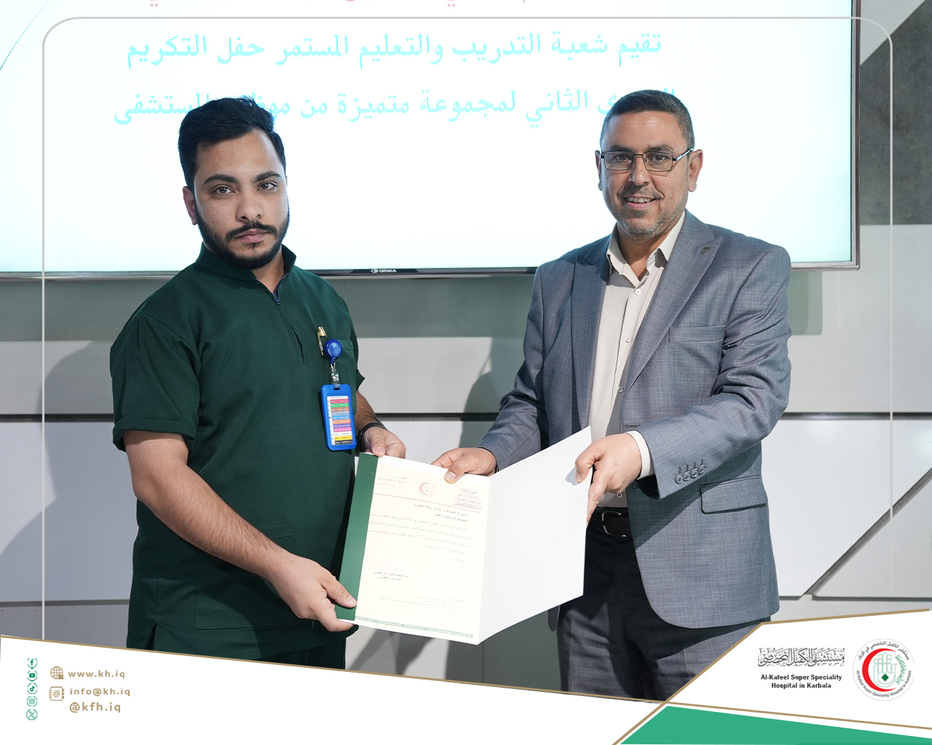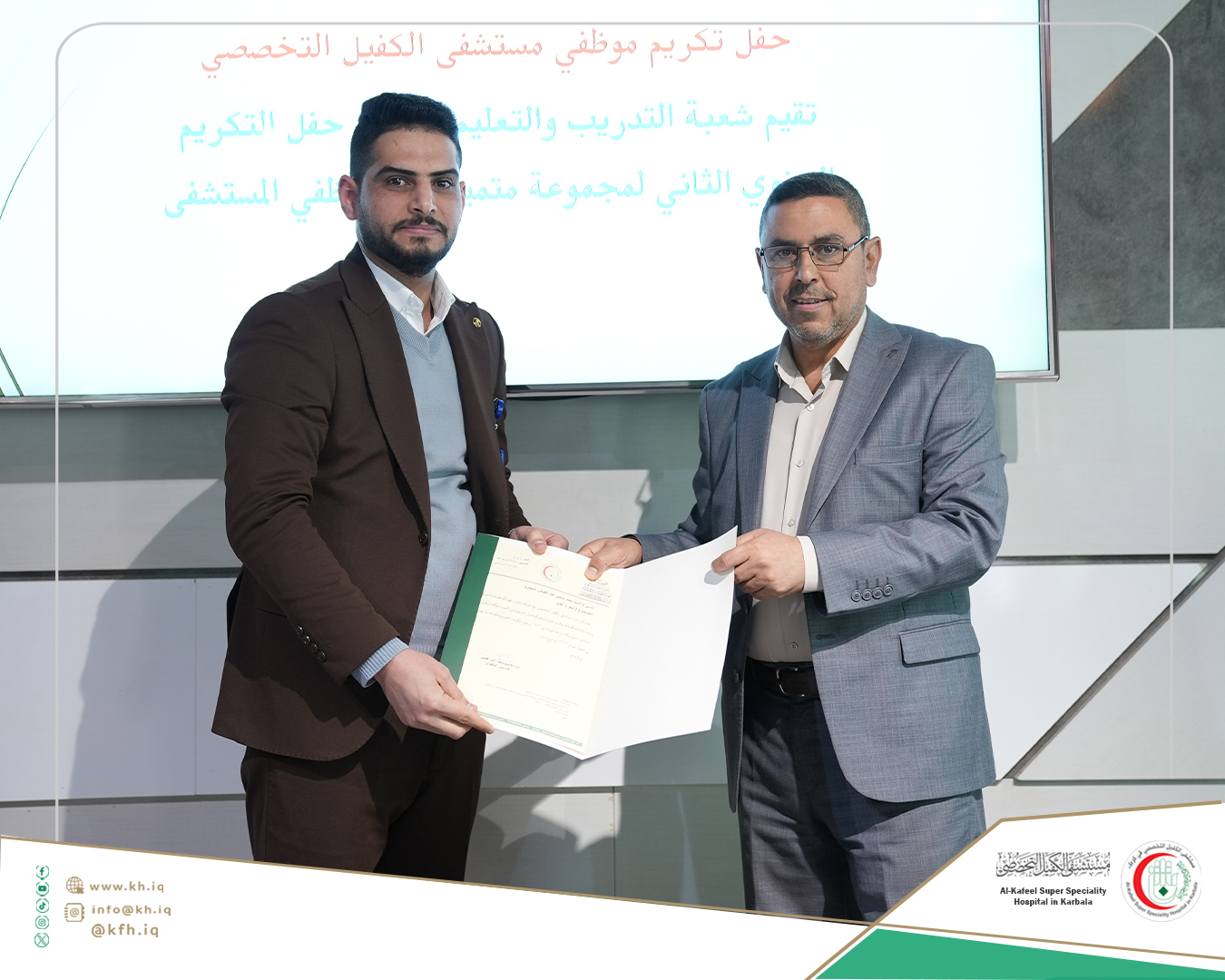 جاء ذلك على هامش الحفل الذي نظمته شعبة التدريب والتعليم المستمر في المستشفى، لتكريم الموظفين الذين حصلوا على تقييمات عالية في التدريبات والورش التي اقيمت خلال عام 2024 المنصرم، وتكريم الموظفين الذين حصلوا على الشهادات الأكاديمية العليا إضافة إلى تكريم المدربين، على قاعة المؤتمرات في المستشفى.