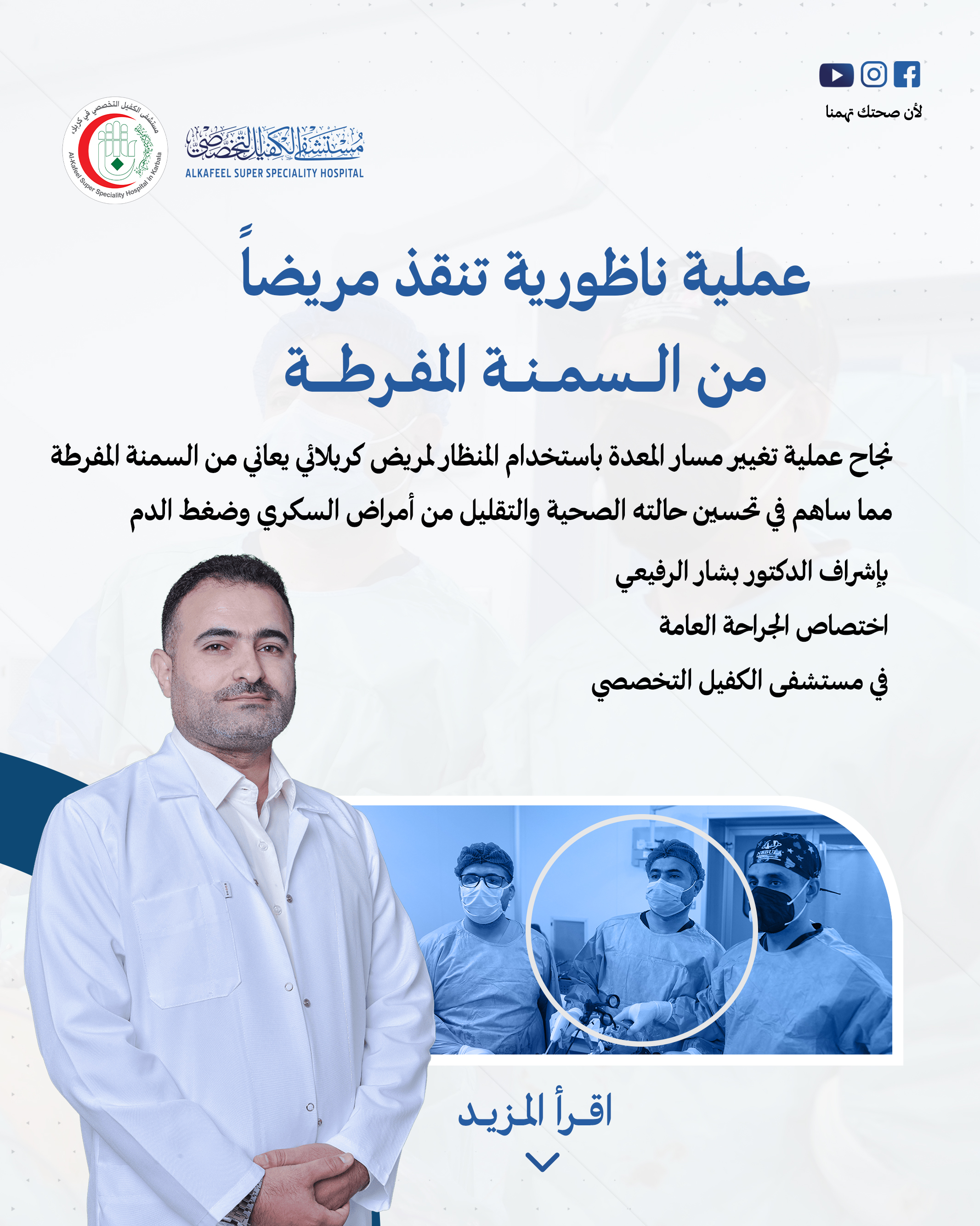 وذكر الدكتور بشار الرفيعي، ان المريض يعاني من السمنة المفرطة والتي تسببت له في مشاكل صحية مزمنة منها ارتفاع ضغط الدم ومرض السكري، مبينا ان العملية تأتي كإحدى الحلول الفعالة لعلاج السمنة المفرطة والتقليل من مضاعفاتها الصحية، حيث تساهم في تقليل الوزن بشكل ملحوظ، فضلاً عن المساعدة في التخفيف من أعراض الأمراض المزمنة الناتجة عن الوزن الزائد، مثل ارتفاع ضغط الدم ومرض السكري.