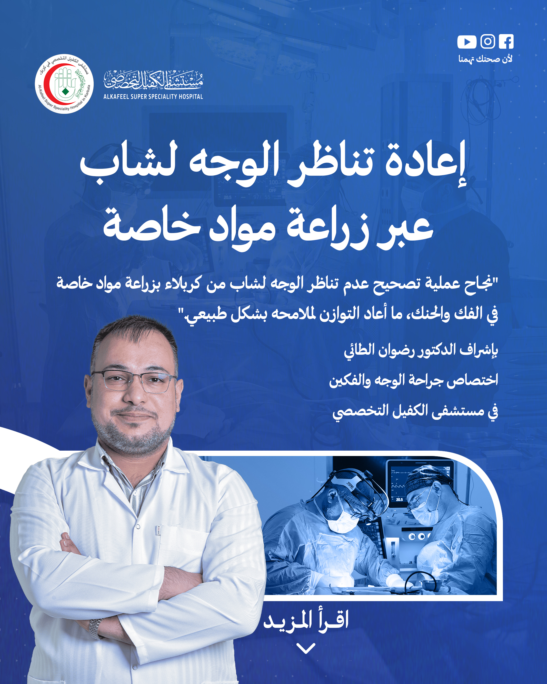 كشف فريق طبي متخصص بجراحة الوجه والفكين في مستشفى الكفيل عن وجود إمكانيات خاصة لاجراء عمليات تقويمية متقدمة لمعالجة انعدام تناظر الوجه من خلال استخدام مواد المانية المنشئ.