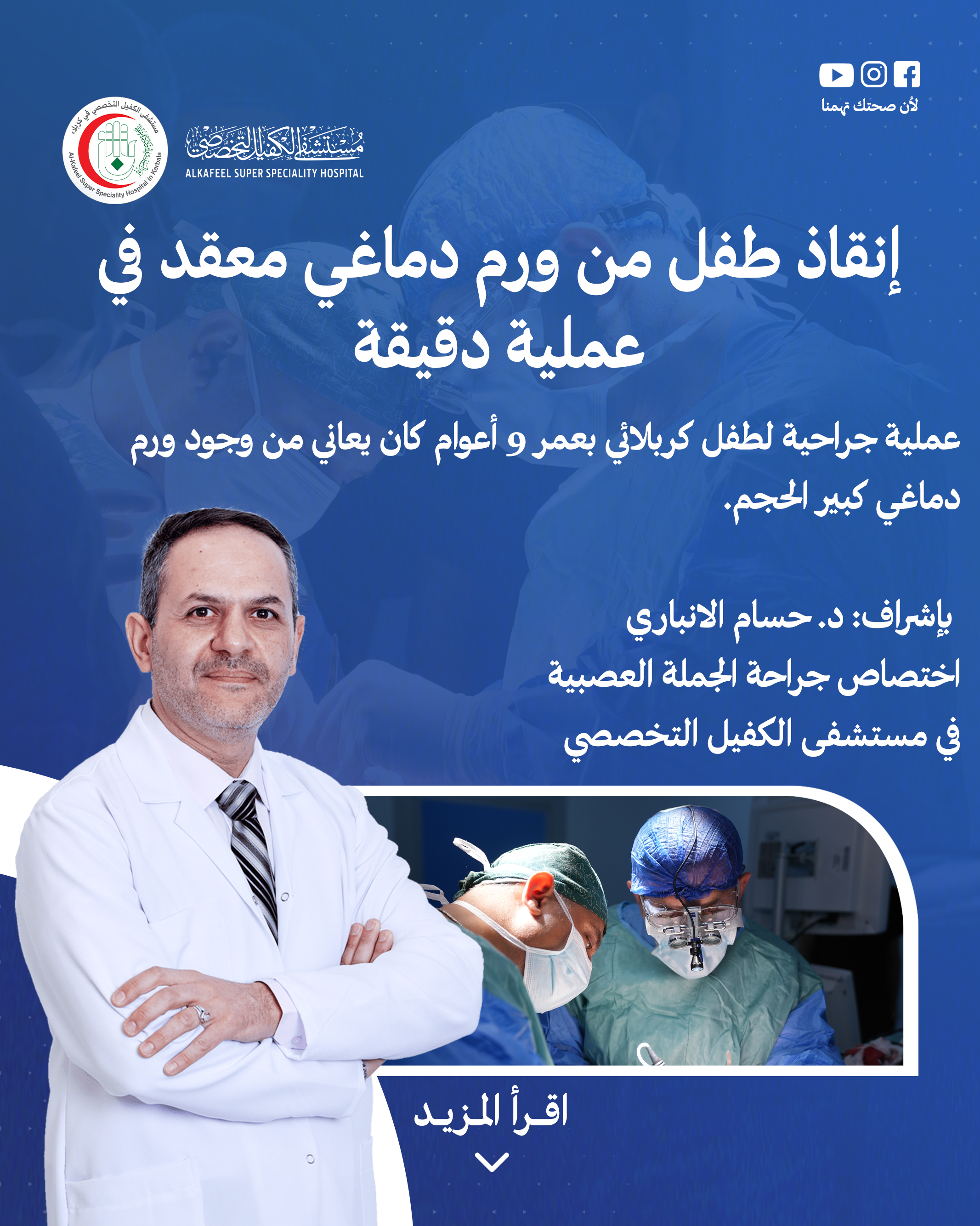وأشار الانباري إلى إن هذه العملية تمثل خطوة مهمة في علاج المرضى الذين يعانون من أورام دماغية كبيرة، وتظهر قدرة الفريق الطبي الجراحي على التعامل مع الحالات المعقدة#مستشفى الكفيل التخصصي #متخصص بجراحة الجملة العصبية #الدكتور حسام الانباري