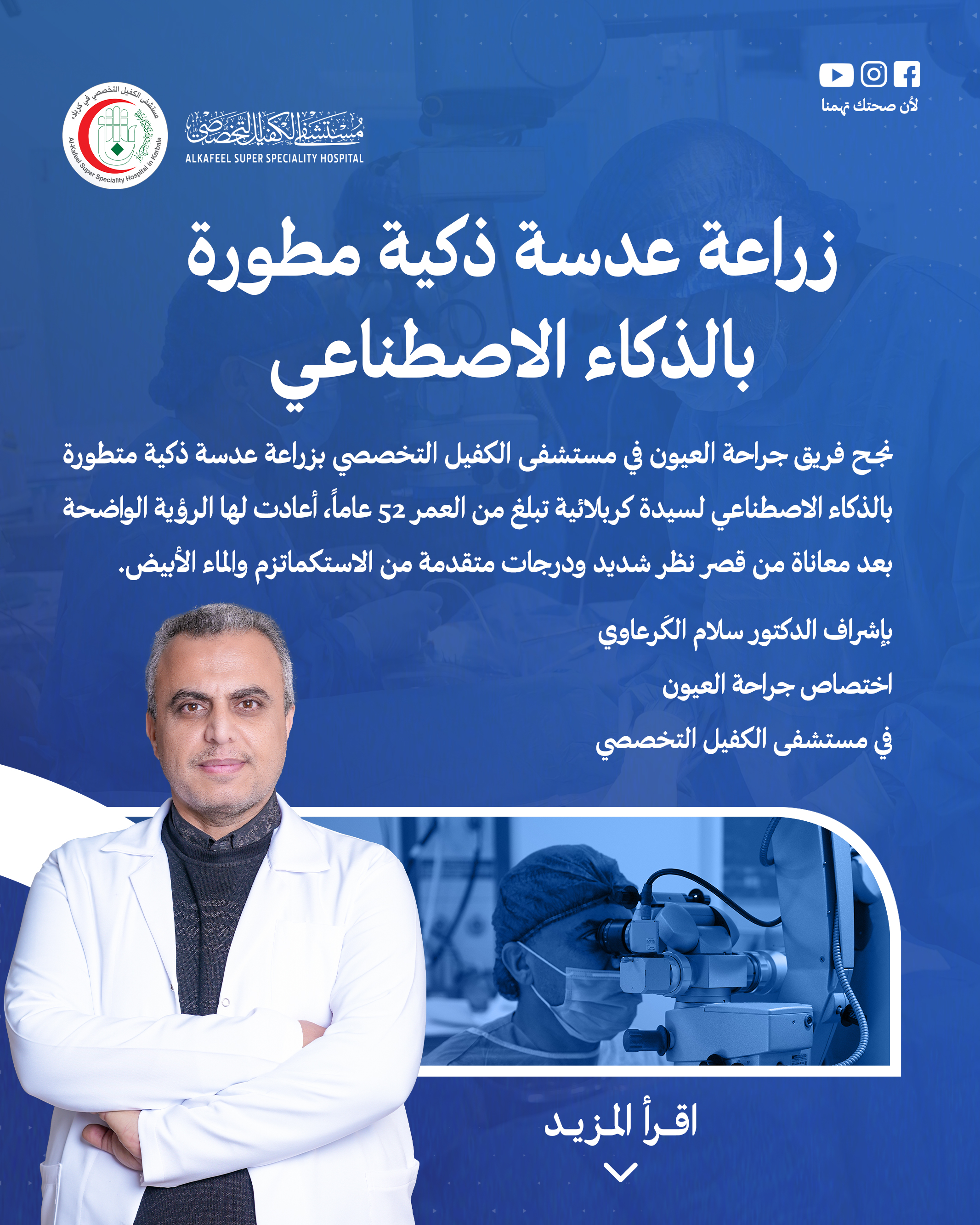 وأشار الكَرعاوي إلى ان العملية تمثلت في استبدال العدسة الطبيعية التالفة بعدسة ذكية من الجيل الأحدث، والتي تم تطويرها بواسطة تقنيات الذكاء الاصطناعي.
