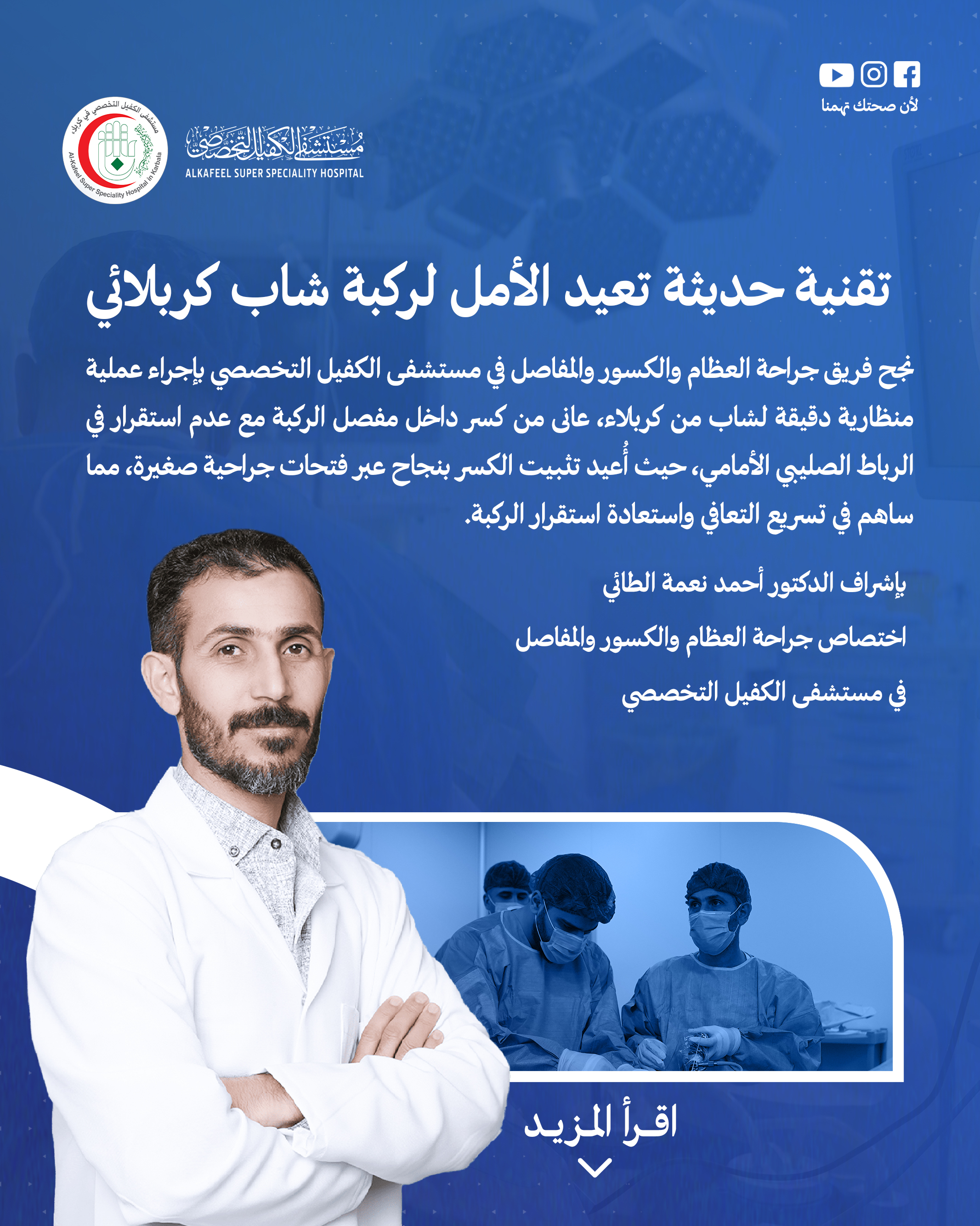 تمكن فريق طبي متخصص بجراحة العظام والكسور والمفاصل، من إجراء عملية جراحية معقدة لشاب كربلائي يعاني من كسر داخل مفصل الركبة مصحوبًا بعدم استقرار في الرباط الصليبي الأمامي.