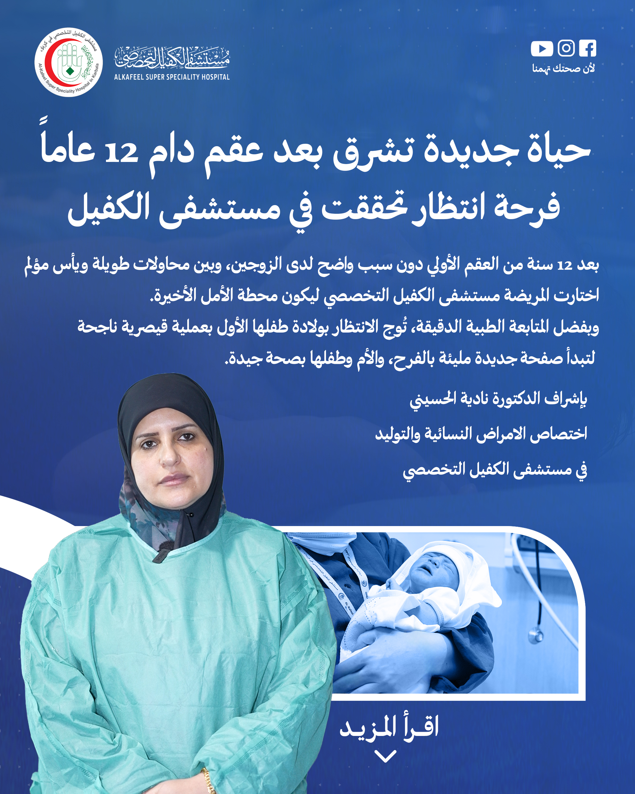 الدكتورة نادية الحسيني، اختصاصية الأمراض النسائية والتوليد، تروي قصة مريضة عانت من عقم أولي لأكثر من 12 سنة، ولم يكن هناك سبباً واضحاً لذلك العقم، سواء من الزوج أو الزوجة، بعد سنوات من اليأس والبحث عن حل، حملت الزوجة بجنين ذكر وقررت اختيار مستشفى الكفيل لتضع وليدها.