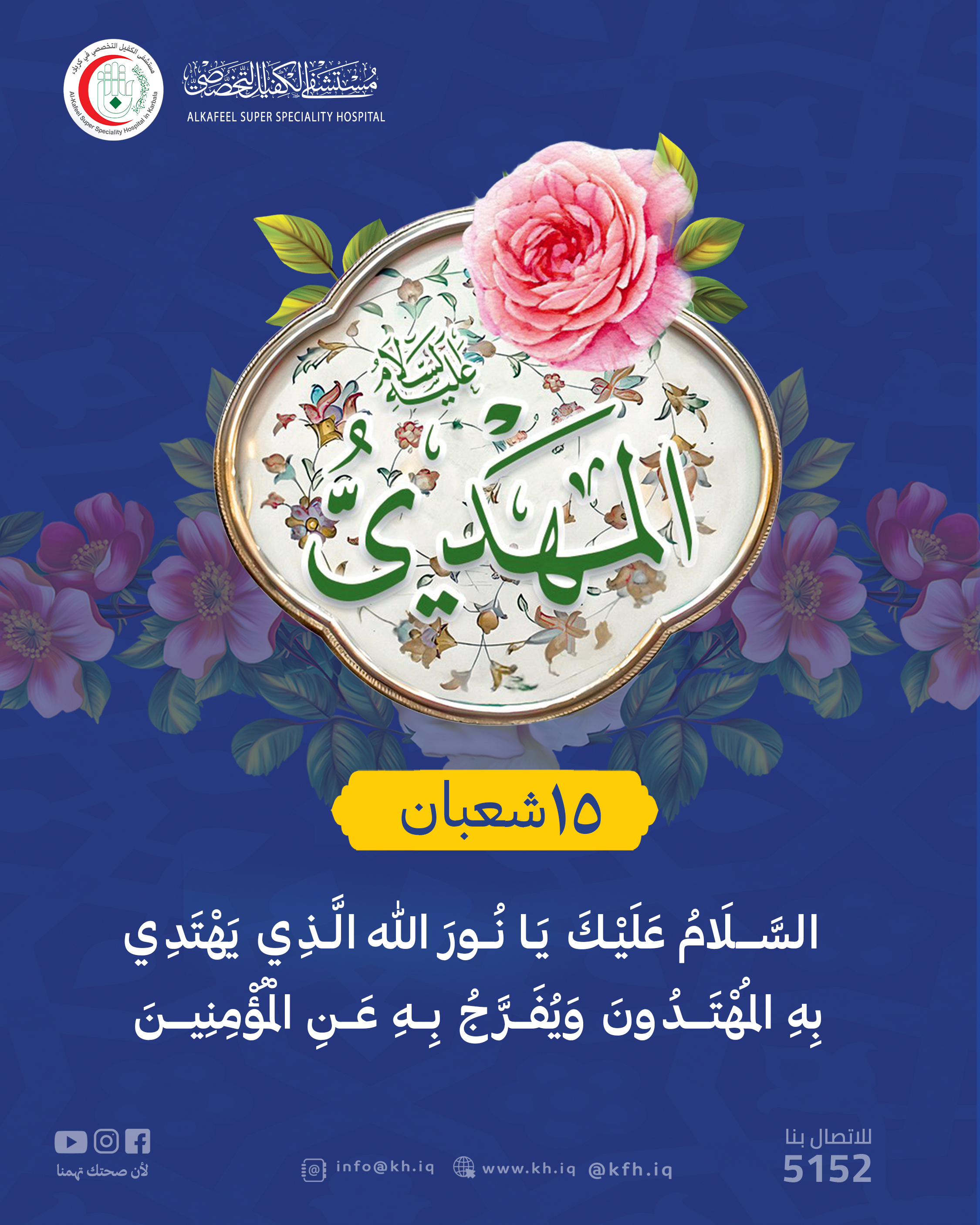 يا صاحبَ الأمرِ العظيمُ مكانةًلكَ نهضةٌ كبرى لها نتعجَّلُيا حِلْمَ أحمدَ يا شجاعةَ حيدرٍيا مُنقِذاً مازالَ عهدُكَ يُؤمَلُيا نورَ فاطمةَ البتولِ وفخرَهايا بنَ الذينَ بِطُهْرِهِمْ يُتوسَّلُيا نهضةَ الحسَنَينِ رَفضاً للخَنايا صبرَ مَنْ ضَحَّوا ولم يتزَلزَلُوافي النصفِ مِنْ شعبانَ أشرَقَ كوكبٌمِن نُورهِ الآفاقُ تَفْتأُ تُنْهِلُنرفع أسمى آيات التهاني والتبريكات الى مقام رسول الله (ص) والى العترة الهادية والى مقام المرجعية الدينية العليا و جميع المؤمنين بمناسبة ذكرى ميلاد منقذ البشرية الامام العدل المنتظر (عجل الله تعالى فرجه الشريف)