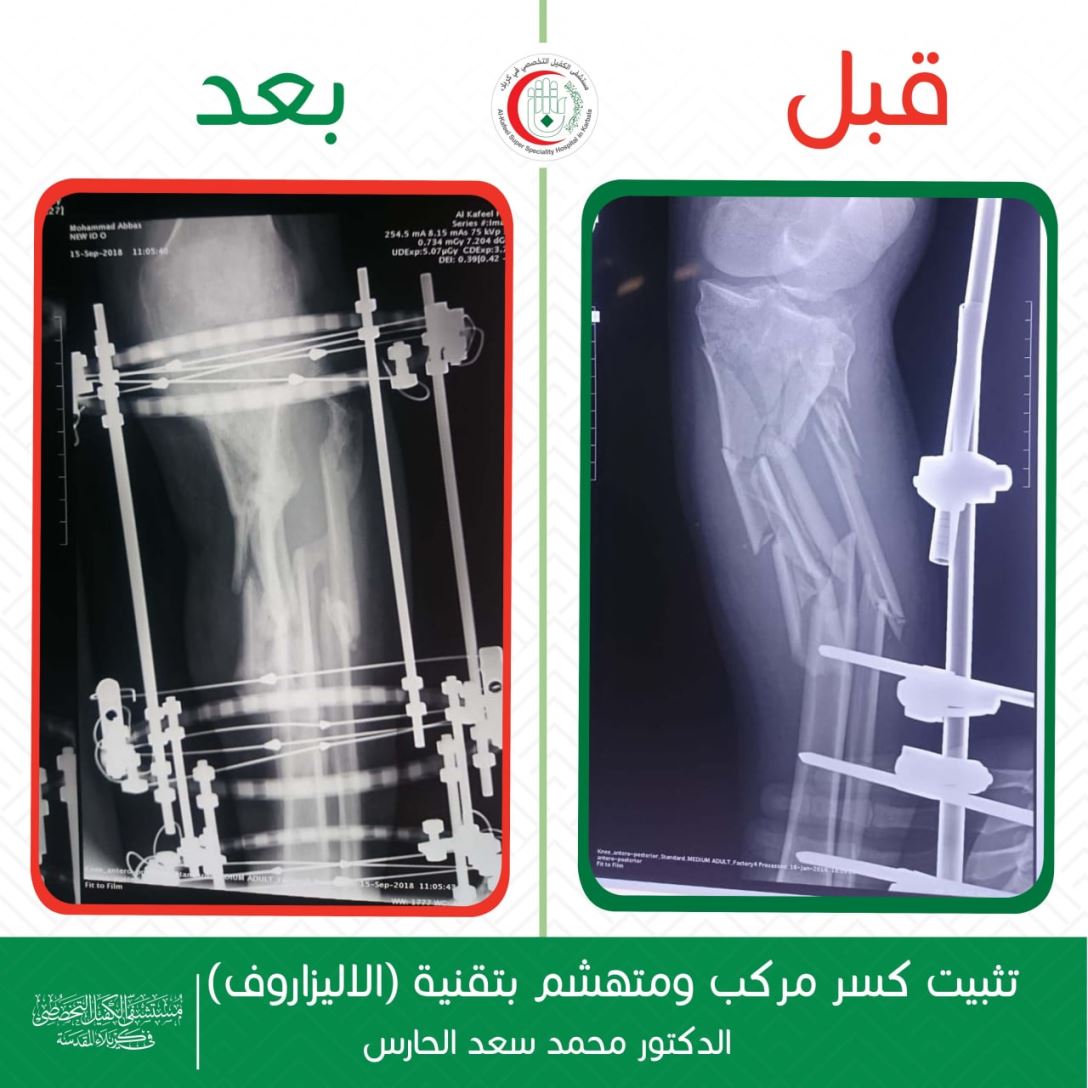 وقال إختصاصي جراحة العظام والكسور والمفاصل بالمستشفى، الدكتور محمد سعد الحارس، في حديث صحافي، إن فريقنا الطبي نجح بعملية تثبيت كسر مركب ومتهشم في أعلى عظم القصبة بالساق الأيسر لمريض يبلغ من العمر (35) عاما، مبيناً إن العملية تمت بإستخدام تقنية الأليزاروف.