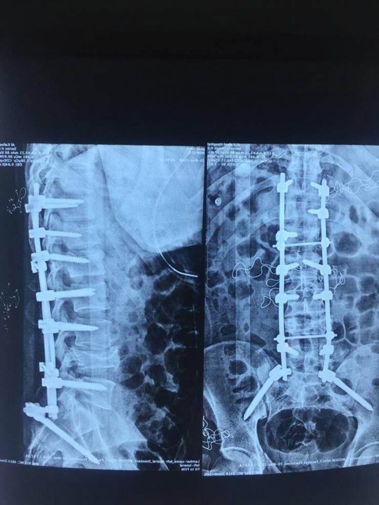 رئيس الفريق المعالج اختصاصي جراحة الجملة العصبية الدكتور خالد السراج، ان فريق طبي برئاستنا نجح بإجراء عملية لتثبيت كسر وتهشم اربعة فقرات وعظام الحوض لشاب من محافظة الديوانية بعمر 26 عاما.