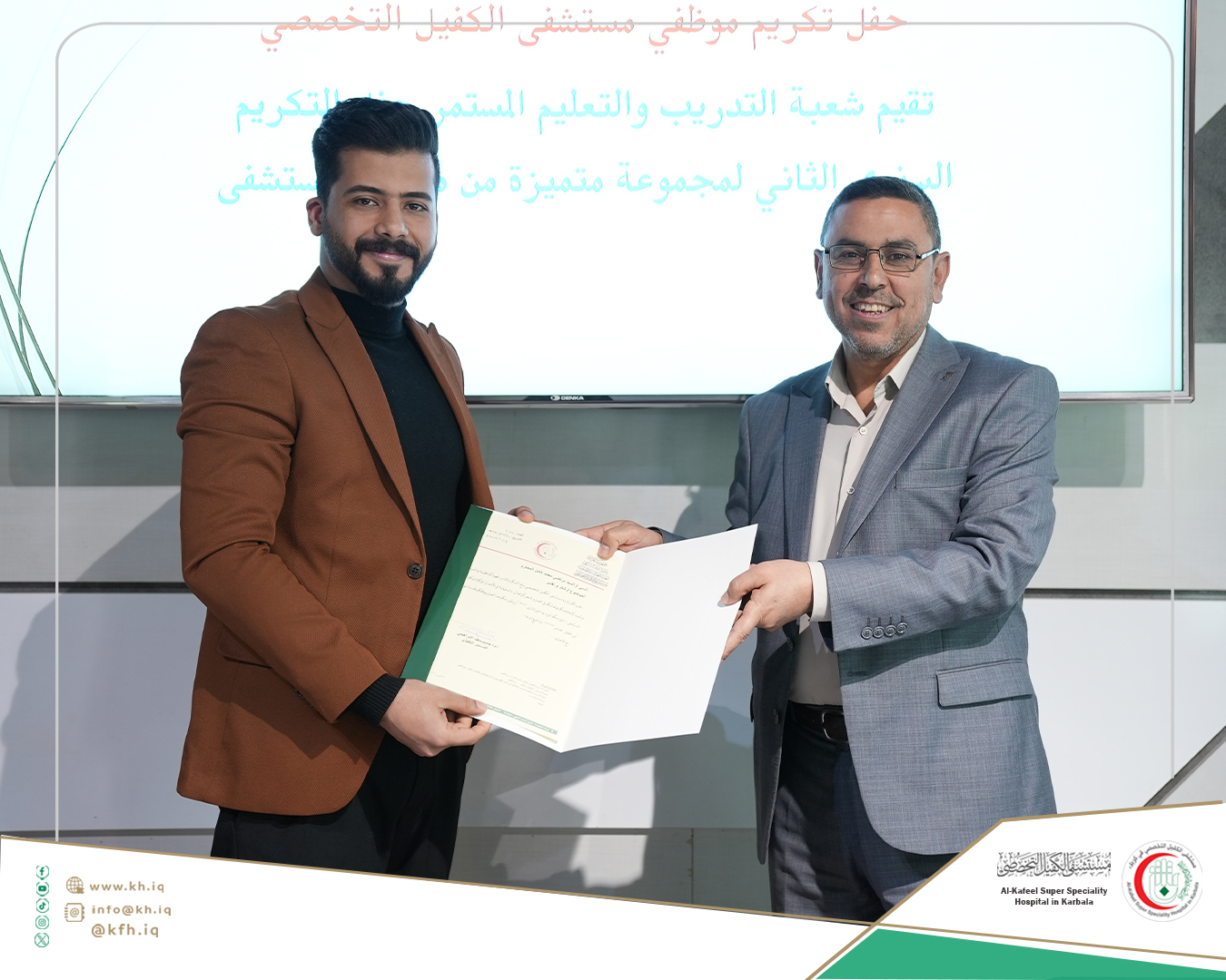 جاء ذلك على هامش الحفل الذي نظمته شعبة التدريب والتعليم المستمر في المستشفى، لتكريم الموظفين الذين حصلوا على تقييمات عالية في التدريبات والورش التي اقيمت خلال عام 2024 المنصرم، وتكريم الموظفين الذين حصلوا على الشهادات الأكاديمية العليا إضافة إلى تكريم المدربين، على قاعة المؤتمرات في المستشفى.