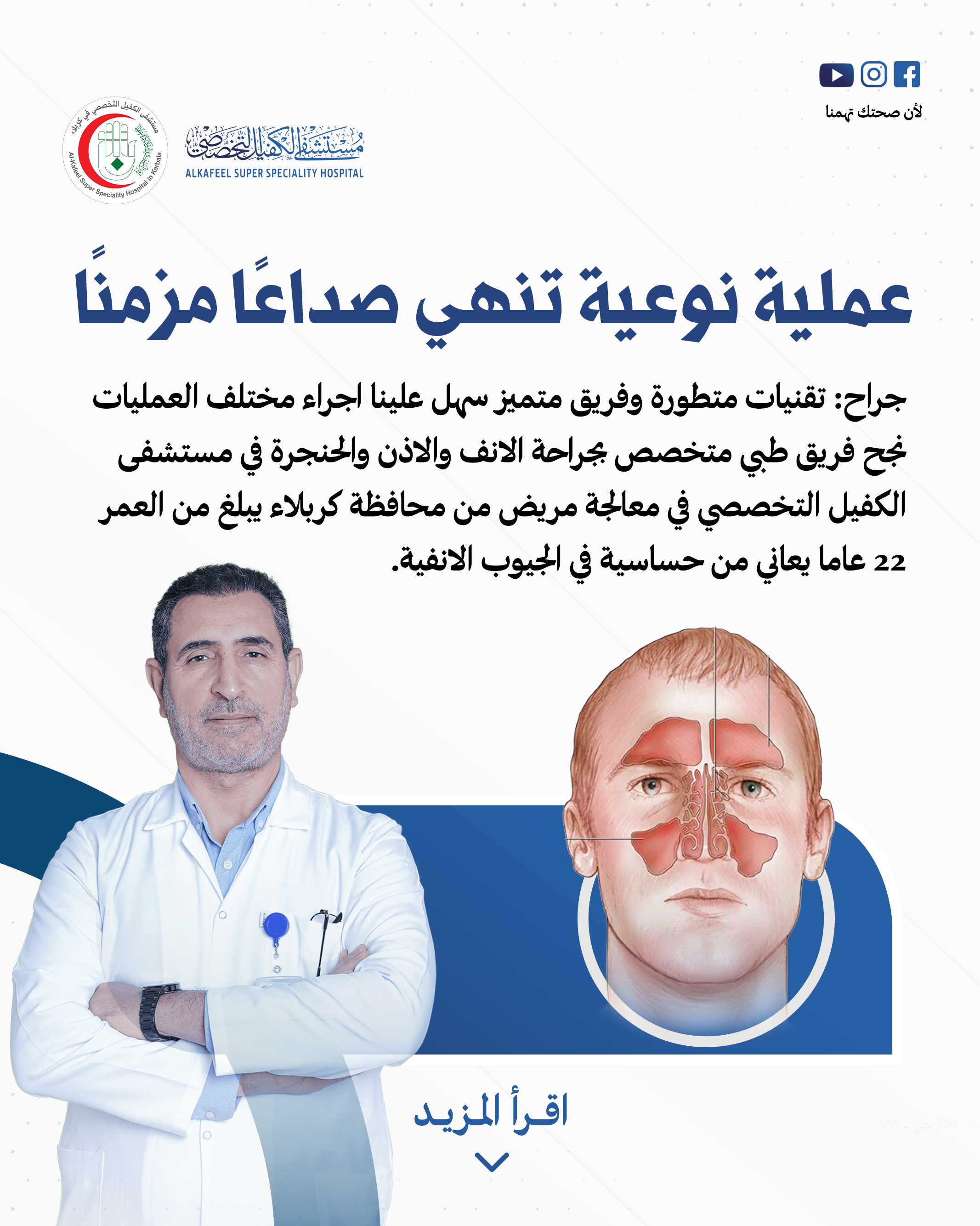 نجح فريق طبي متخصص بجراحة الانف والاذن والحنجرة في مستشفى الكفيل التخصصي في معالجة مريض من محافظة كربلاء يبلغ من العمر 22 عاما يعاني من حساسية في الجيوب الانفية.