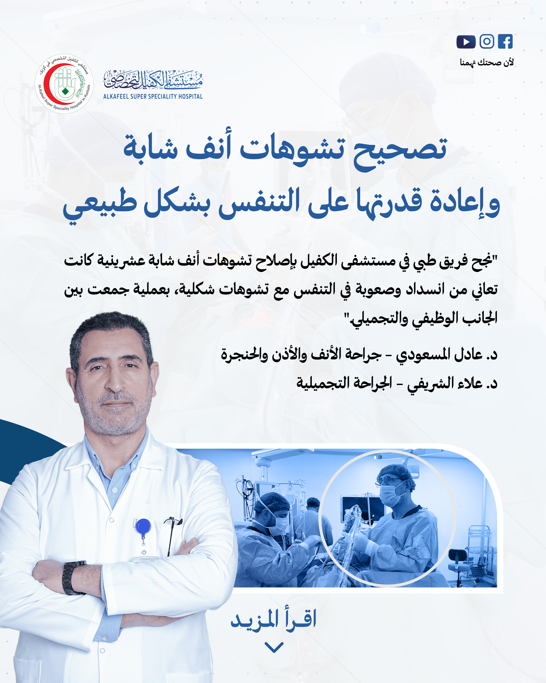 كشف فريق طبي متخصص في مستشفى الكفيل التخصصي بكربلاء عن نجاحه بعملية اصلاح تشوهات الانف لشابة تعاني من ضيق النفس والشخير.