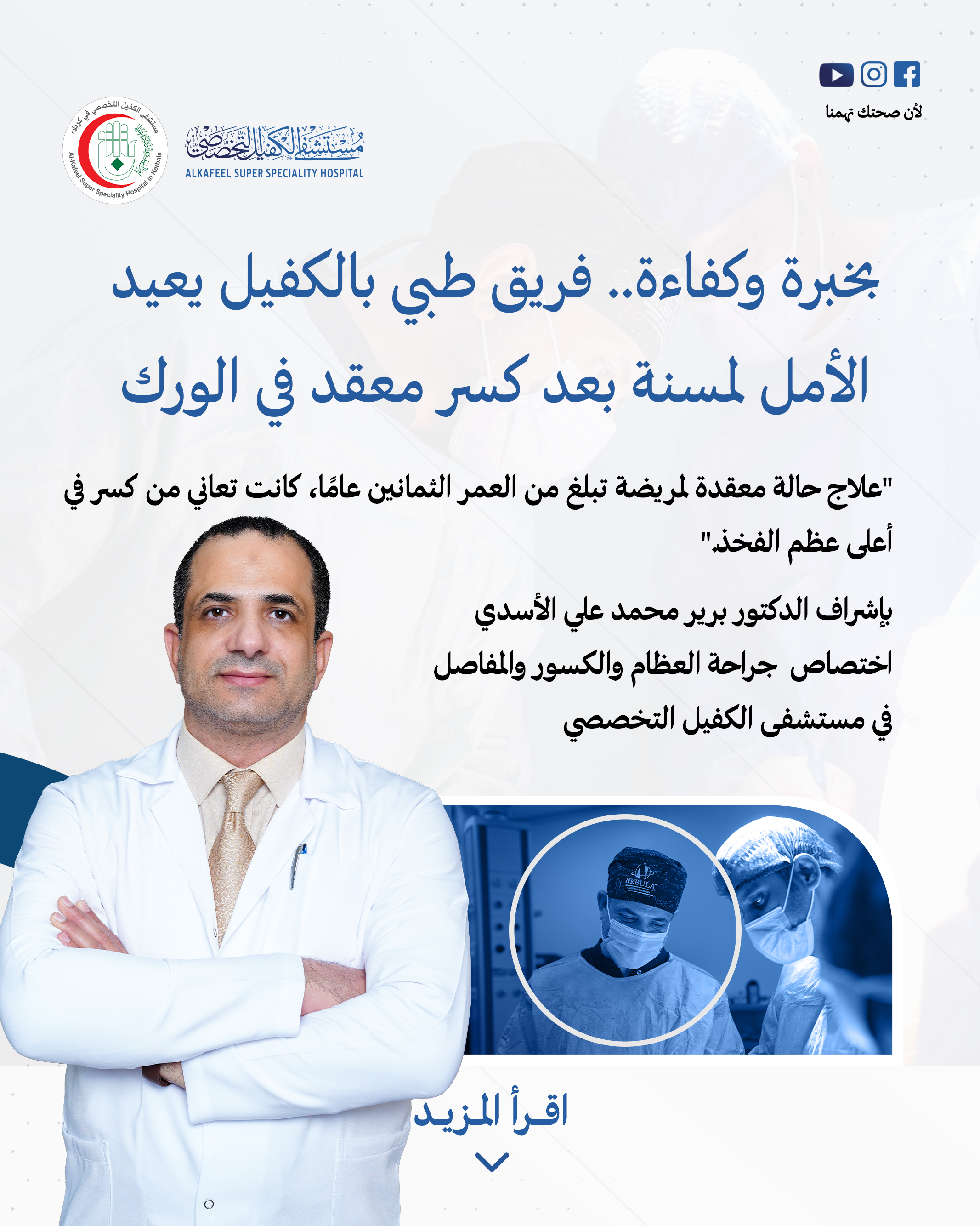 حقق فريق جراحة العظام والكسور والمفاصل في مستشفى الكفيل التخصصي نجاحا طبيا مميزا، حيث تمكن من علاج حالة معقدة لمريضة تبلغ من العمر الثمانين عامًا، كانت تعاني من كسر في أعلى عظم الفخذ، أو ما يُعرف بكسر حول الورك الأيسر، والذي بقي متروكًا لمدة شهر كامل نتيجة للخوف من مخاطر التخدير والعملية.