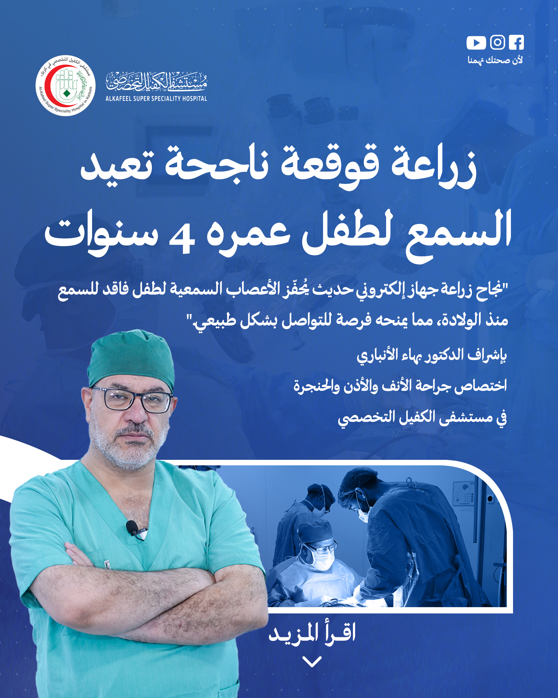 أجرى فريق طبي متخصص بجراحة الأنف والأذن والحنجرة في مستشفى الكفيل التخصصي بكربلاء، عملية زراعة قوقعة لطفل عمره 4 سنوات من مدينة كربلاء، يعاني من فقدان السمع منذ ولادته.