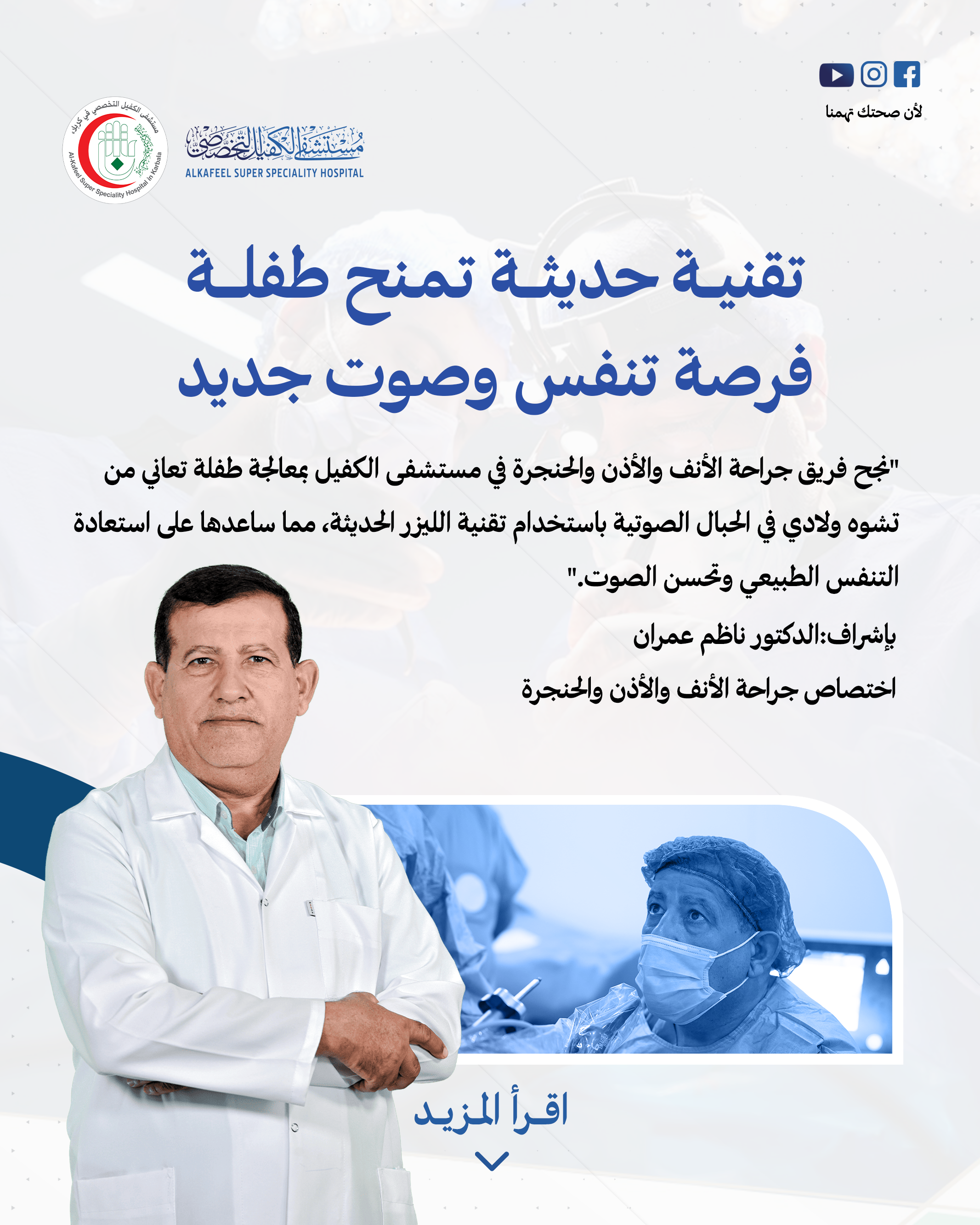 وذكر الدكتور الاستشاري ناظم عمران، إن التشوه الذي تعاني منه الطفلة تسبب لها ببحة في الصوت وصعوبة في التنفس، مبينا انه بعد معاينة الحالة وإجراء كافة الفحوصات اللازمة، بما فيها الناظور، تم الإستعداد للعملية باستخدام تقنية الليزر الحديثة، والتي تتيح دقة عالية ونتائج فعالة دون الحاجة إلى تدخل جراحي كبير.