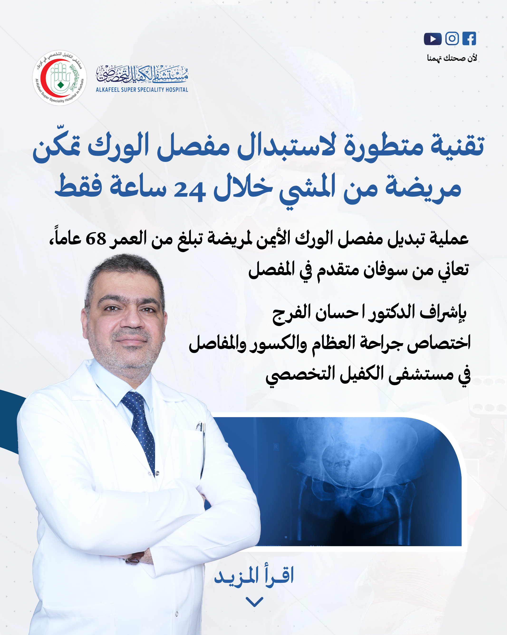 وأشار فرج إلى أن مستشفى الكفيل التخصصي يحرص على استخدام مفاصل من أرقى المناشئ العالمية، وتوفير أحدث الأدوات والمكونات في صالات العمليات الجراحية لضمان أفضل النتائج للمرضى.