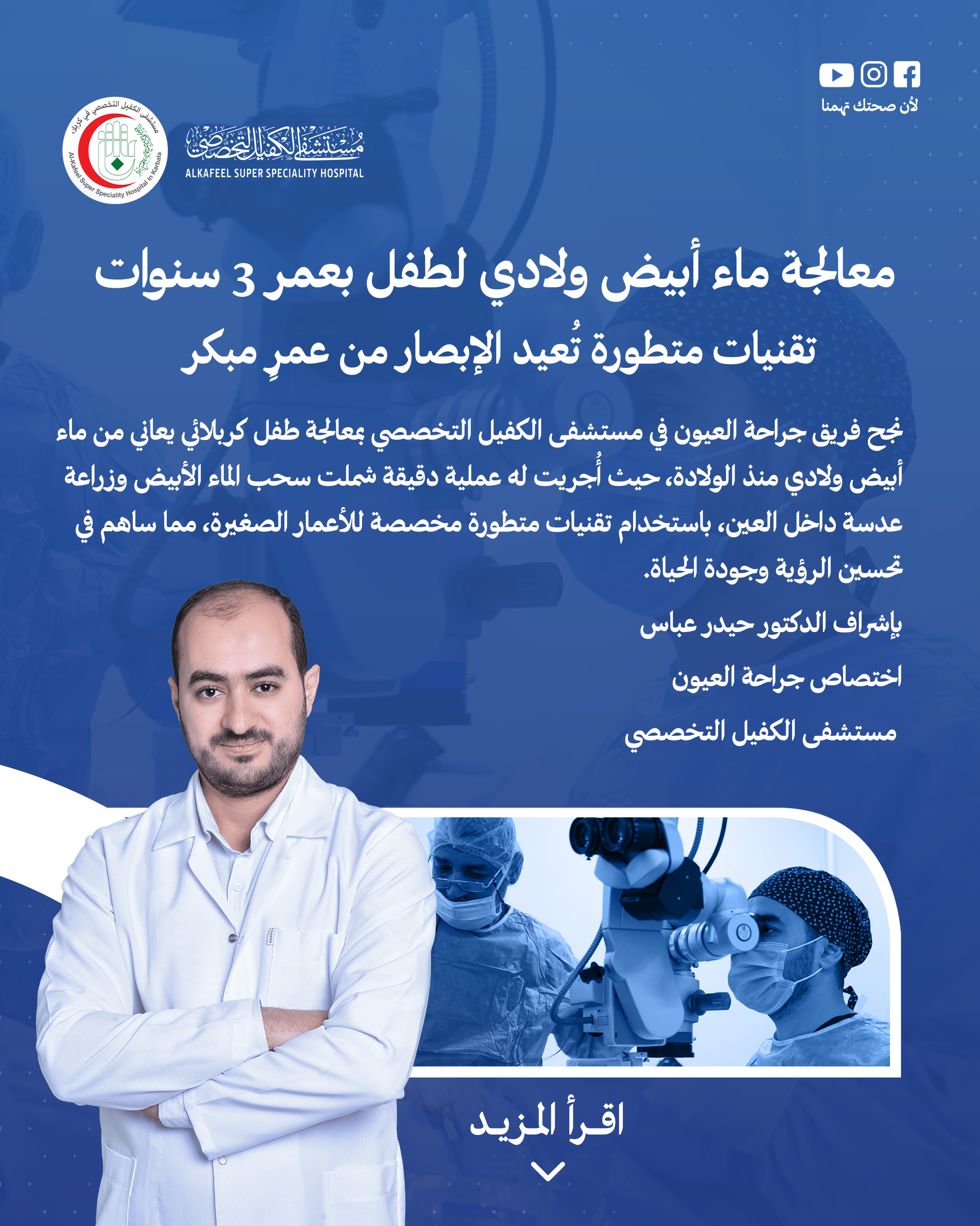 اعلن فريق طبي متخصص بجراحة العيون في مستشفى الكفيل التخصصي بكربلاء عن نجاحه بمعالجة طفل بعمر الثلاث سنوات كان يعاني من ماء ابيض منذ ولادته، فيما أشاد بالخبرات والتقنيات التي وفرها المستشفى بانجاح هذا النوع من العمليات المتميزة.