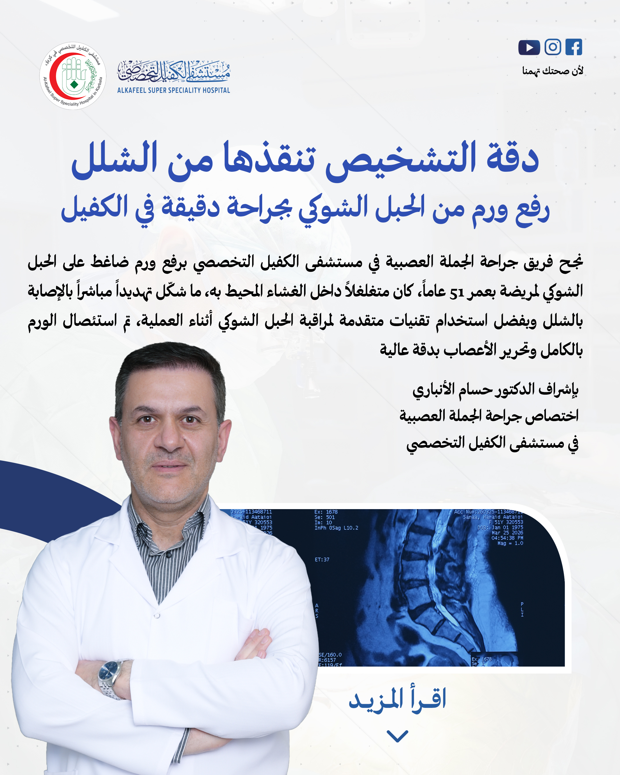 خلف كل خطوة نمشيها ببساطة، هناك نسيج معقد من الأعصاب قد يتعرض لخطر صامت. مريضة كربلائية بعمر الـ (51 عاماً) عاشت شهرين من المعاناة، حيث بدأ جسدها يخذلها، ضعفٌ في الأطراف السفلى، وعجزٌ عن صعود الدرج، وصعوبة بالغة في المشي، هذا مارواه الدكتور حسام الانباري اختصاصي جراحة الجملة العصبية.
