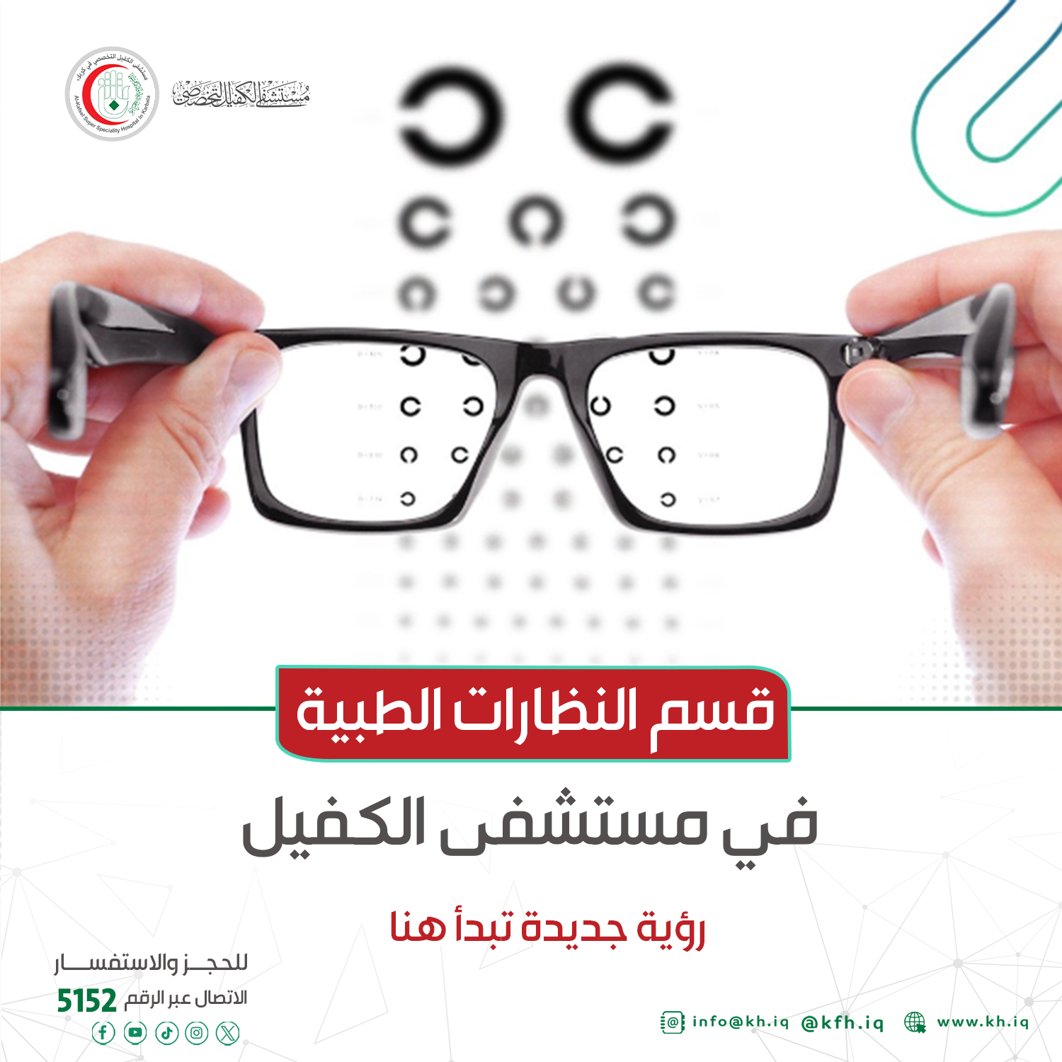 نقدم لكم خدمات متكاملة لقسم النظارات الطبية في قسم طب وجراحة العيون لفحص النظر وتصميم النظارات الطبية بأعلى المعايير وبأحدث التقنيات. يهدف قسمنا الجديد إلى تلبية احتياجاتكم البصرية وضمان رؤيتكم بشكل أفضل. زورونا في مستشفى الكفيل واستفيدوا من خدماتنا المميزة